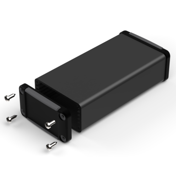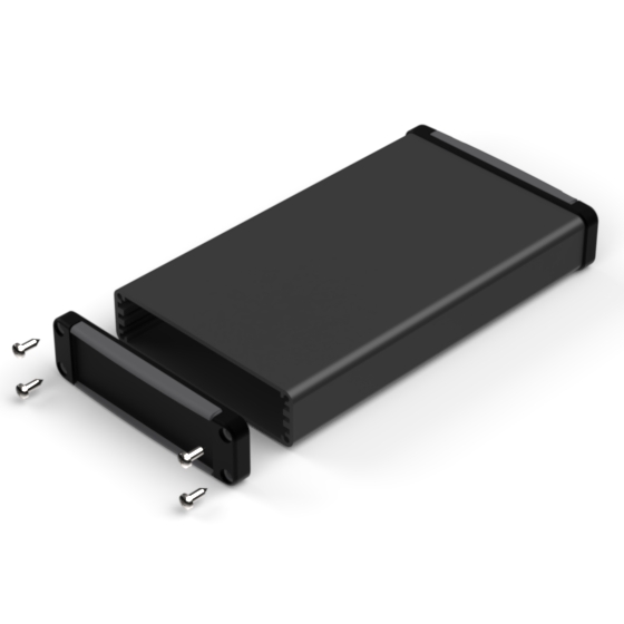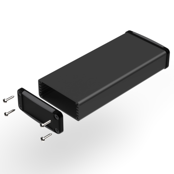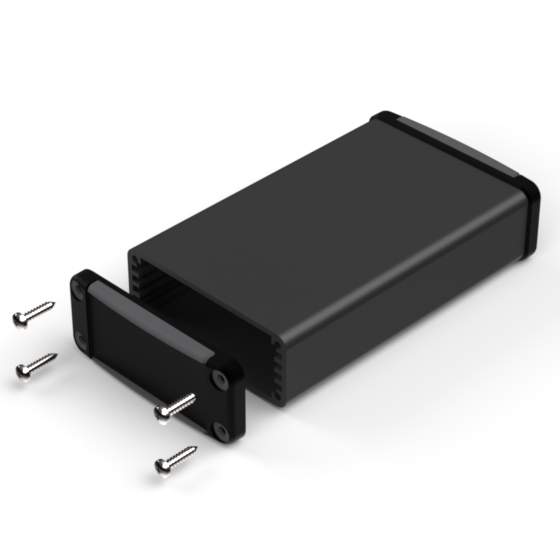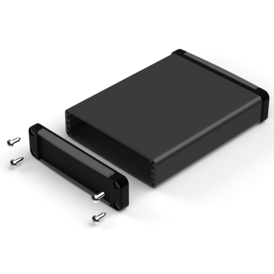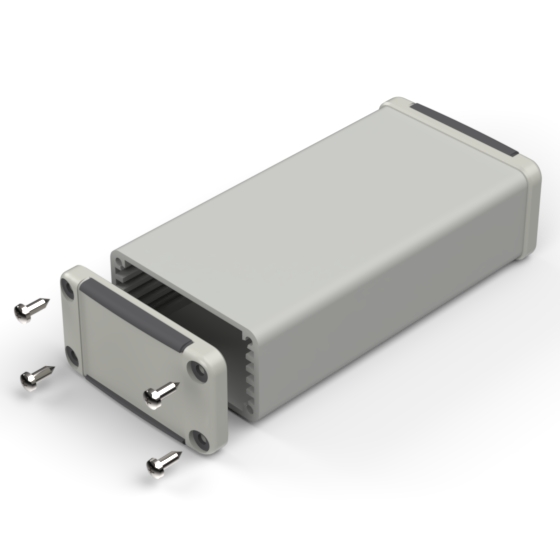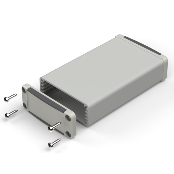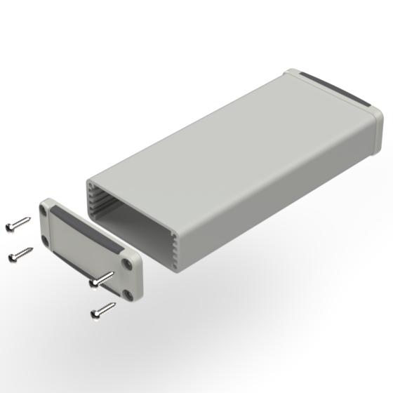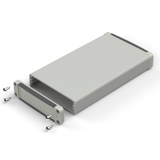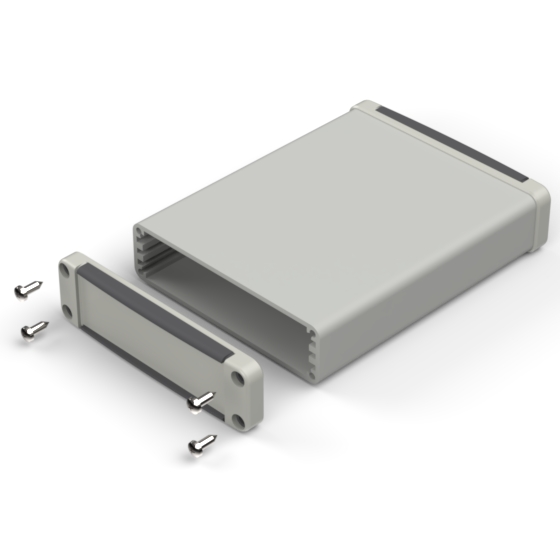 Kleingehäusereihe aus extrudierte Aluminium mit oberflächiger Pulverbeschichtung, komplett mit zweifarbigen Frontplatten, die bei der Benutzung von Doppelspritztechnik (ABS + TPU) entwickelt sind. Die Frontplatten sind mit integriertem Dichtungs-Set zum Schutz gegen Wasser und Pulver versehen (IP65). I n t e g r i e r t e Führungsrippen f ü r PCB. Verschluss m i t acht Schrauben.