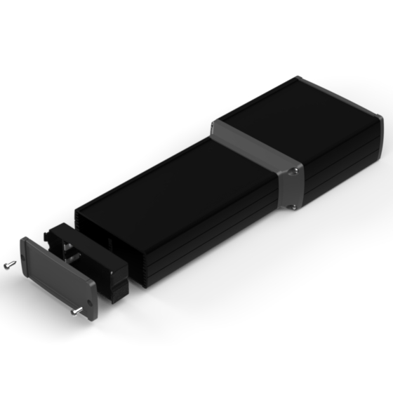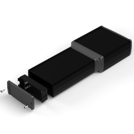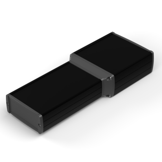Formschönes Profilgehäuse aus eloxiertem Aluminium mit qualitativ hochwertiger Oberflächelackierung, besonders geeignet für Anwendung als Handgehäuse. Ideal für Fernbedienung mit Tastatur oder Display. Integrierte Führungen für PCB. Die Modelle mit „-B“ haben ein Batteriefach für zwei 1,5V (AA) oder eine 9V (PP3) Batterien. Montage mit zwölf Schrauben.