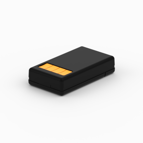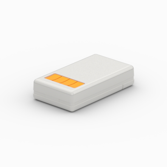Kunststoffgehäuse mit abgerundeten Ecken. 9V-Batteriefach mit einschiebbarem Schnappdeckel. Das Modell „RC124“ hat eins, zwei oder vier gelbe Drucktasten. Das Modell „10009A-B“ hat ein transparentes Sichtfenster im Oberteil. Matte Oberfläche. Montage mit nur einer Schraube. Nach Anfrage, Ansteckclip aus rostfreiem Stahl (Mod. CL1).