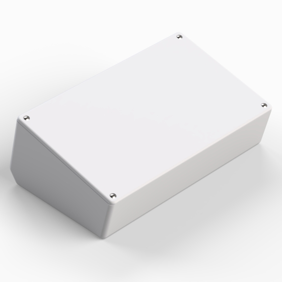 Kunststoffgehäuse mit um 15° geneigter Platte. Das Unterteil hat integrierte Führungen und Montagepfeiler für PCB. Die Ecken sind abgerundet. Glänzende Oberfläche. Montage mit 4 Schrauben.