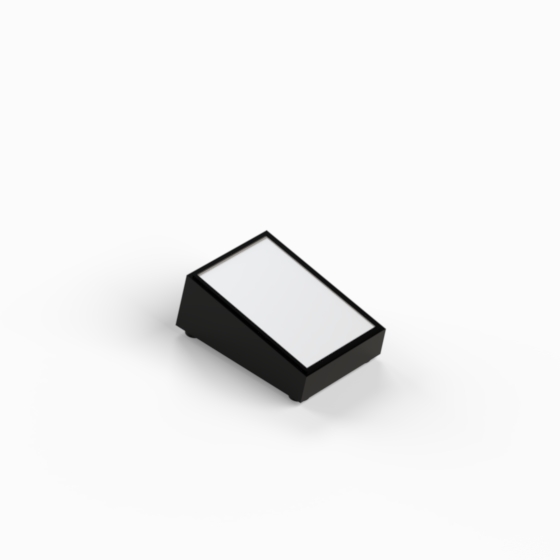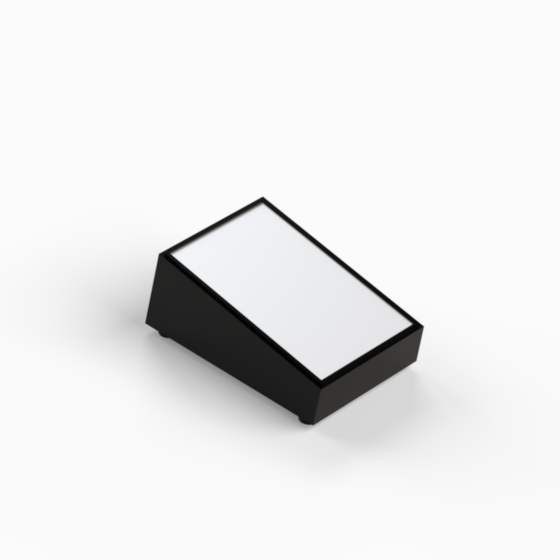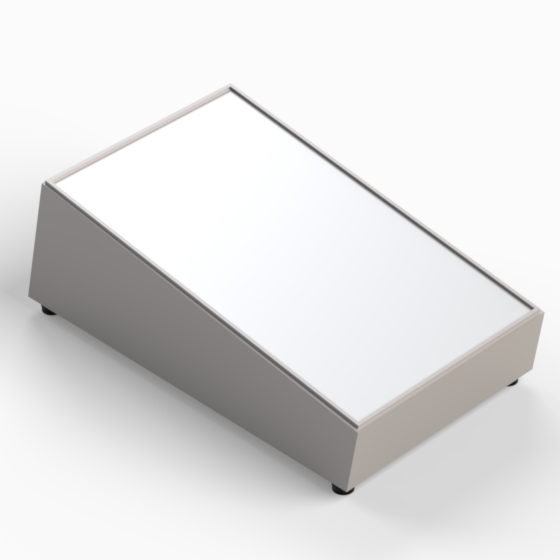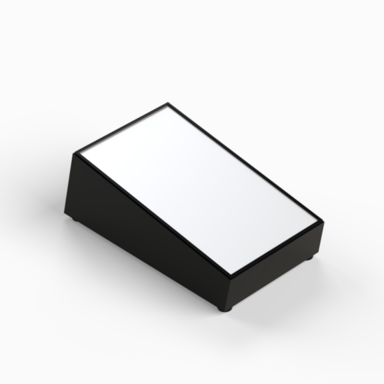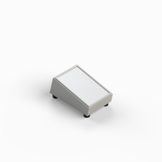 Scharfkantiges Kunststoffgehäuse mit 10° oder 12° Neigung zur leichten Handhabung bzw. Ablesbarkeit und 4 rutschfesten Füßen (Mod. PT/4). Innenwände des Unterteils mit integrierten Führungen für PCB. Zwei Aluminiumplatten, die mit 4 Schrauben montiert werden.