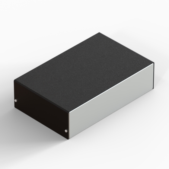Aluminium enclosures with silver metalised base and black cover. Simple and speedy to assemble, with four screws to put in place.