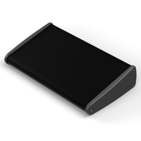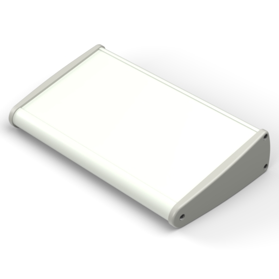 Inclined extruded aluminium case with high quality painted finishing. Two ABS side panels, internal guides for PCB, recessed area for membrane keypad.Closing by six screws. Two colours combinations: black RAL 9004 / grey RAL 7012 - white RAL 9002 / light grey RAL 9018. Upon request wall-suspension element “MT7.0”.